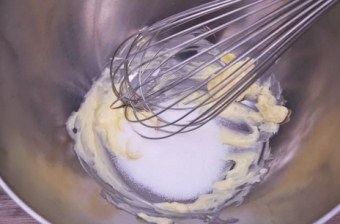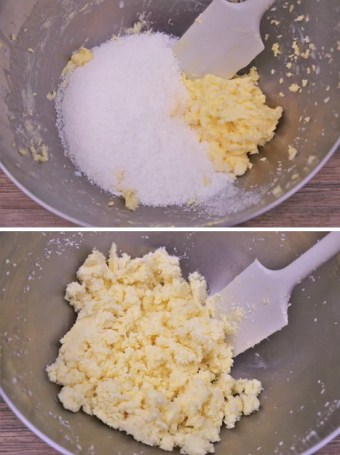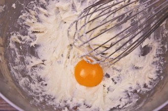 先用刮刀压匀,再用电动打蛋器搅打至颜色发白、体积膨胀