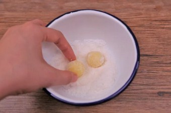 将揉好的椰蓉球滚上一层椰蓉装饰