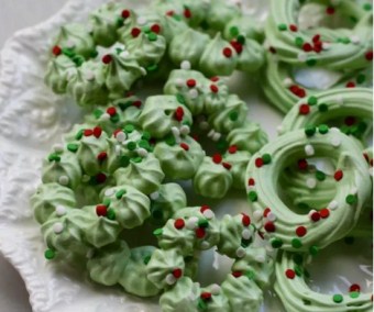 1、这个配方混合成的绿色蛋白糖霜,可以用来制作圣诞树,也可以做圣诞花环,只是挤出的形状及装饰不同而已。如果不加入色素,就是基本的蛋白糖霜,可以自行调成需要的颜色。