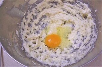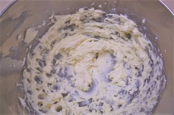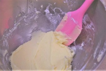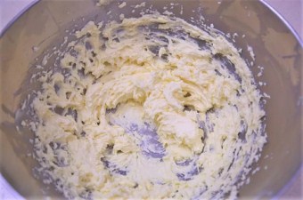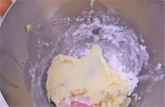 ①室温软化的无盐黄油中,加糖粉用电动打蛋器搅打至颜色发白、体积膨胀