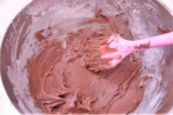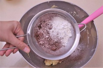③低筋面粉和可可粉过筛加入黄油中,用刮刀拌匀至没有干粉