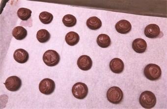 ④裱花袋里套圆形裱花嘴,然后把面糊装进裱花袋,将裱花嘴垂直于烤盘约1厘米高度,无需转圈,在铺了烤纸的烤盘上直接挤出半圆形坨坨