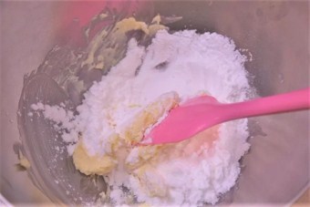 ①室温充分软化的无盐黄油中,加入糖粉拌匀